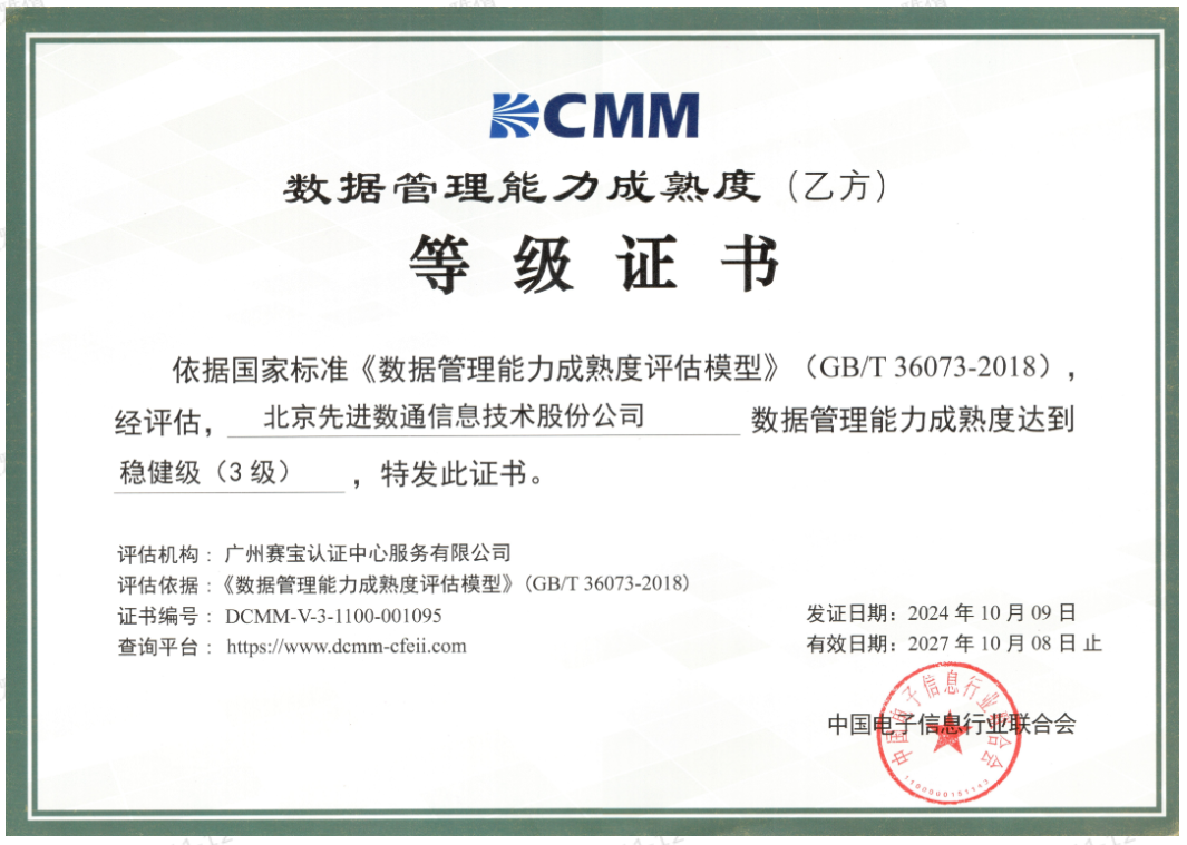 近期,中国电子信息行业联合会公布了最新一批顺利获得数据管理能力成熟度(DCMM)贯标等级认证的企业名单。NO钱包官网成功取得数据管理能力成熟度稳健级(三级)认证。这一认证的取得,标志着NO钱包官网在数据治理体系构建和数据管理与应用能力方面,已经达到了国家权威组织认可的标准。这不仅是对NO钱包官网在数据管理领域专业能力的肯定,也是对其在有助于数字化转型服务和数据驱动决策方面所做努力的认可。